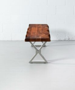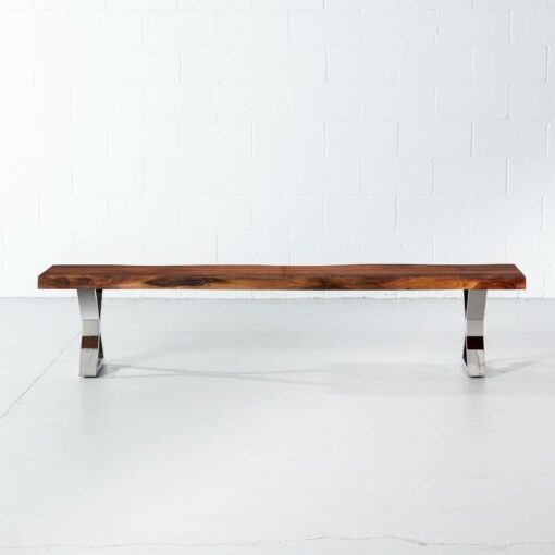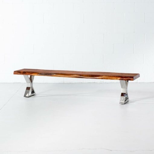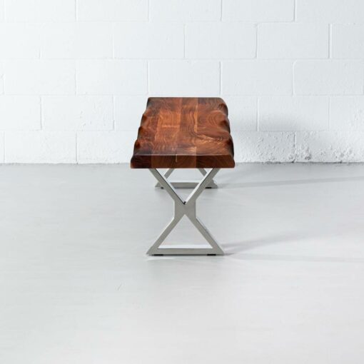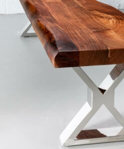 The Colbert acacia live edge bench comes in a natural finish, paired with our industrial stainless steel x shaped legs with a mirror like finish. Handcrafted from solid acacia wood, Colbert brings a modern rustic look to any space as a wooden bench in the dining room, hallway, bedroom or even used as a narrow coffee table in the living room. Colbert will bring natural vibrance to your living space for years to come.