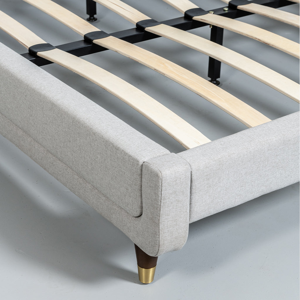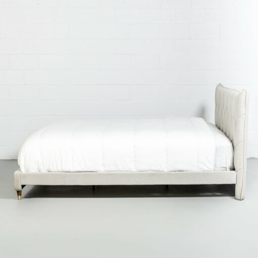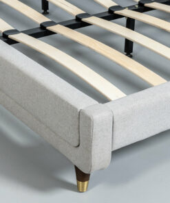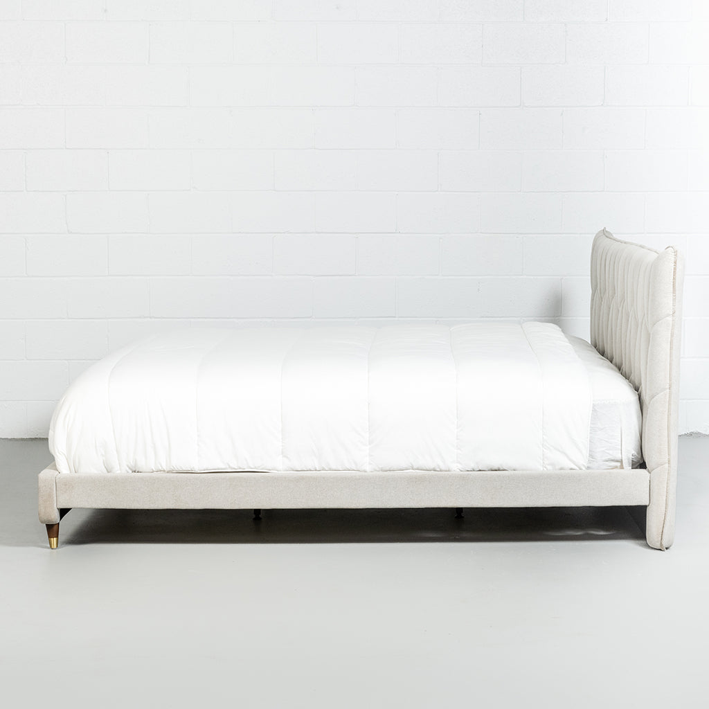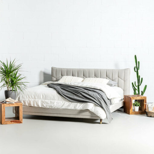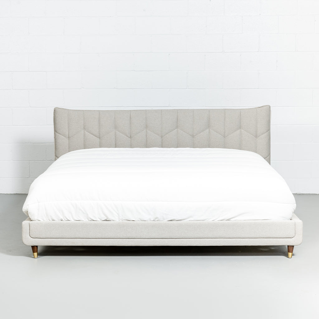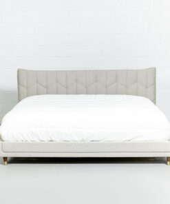 Elegant, modern and cozy, our Maple Bed in dreamy light grey will add warmth to your bedroom. Beautiful from all angles, this statement-making bed, with its sculpted headboard, rich upholstery, and pretty tufting is a show-stopper. Available in both dark blue and light grey.