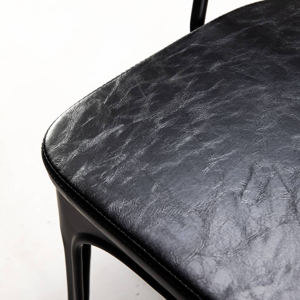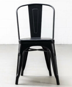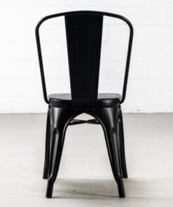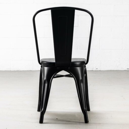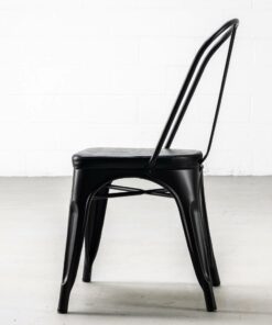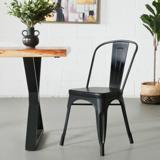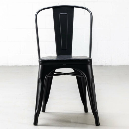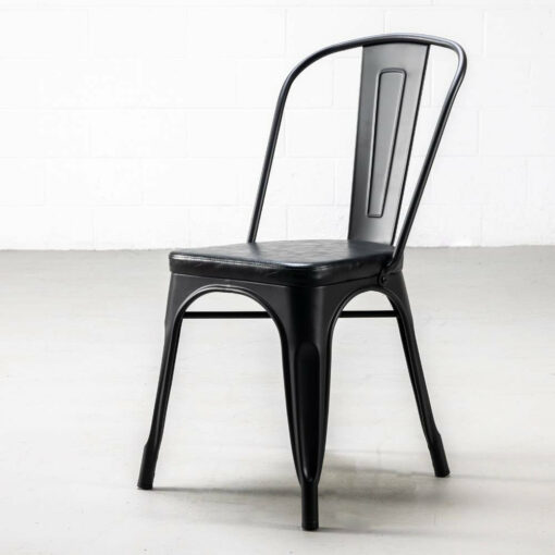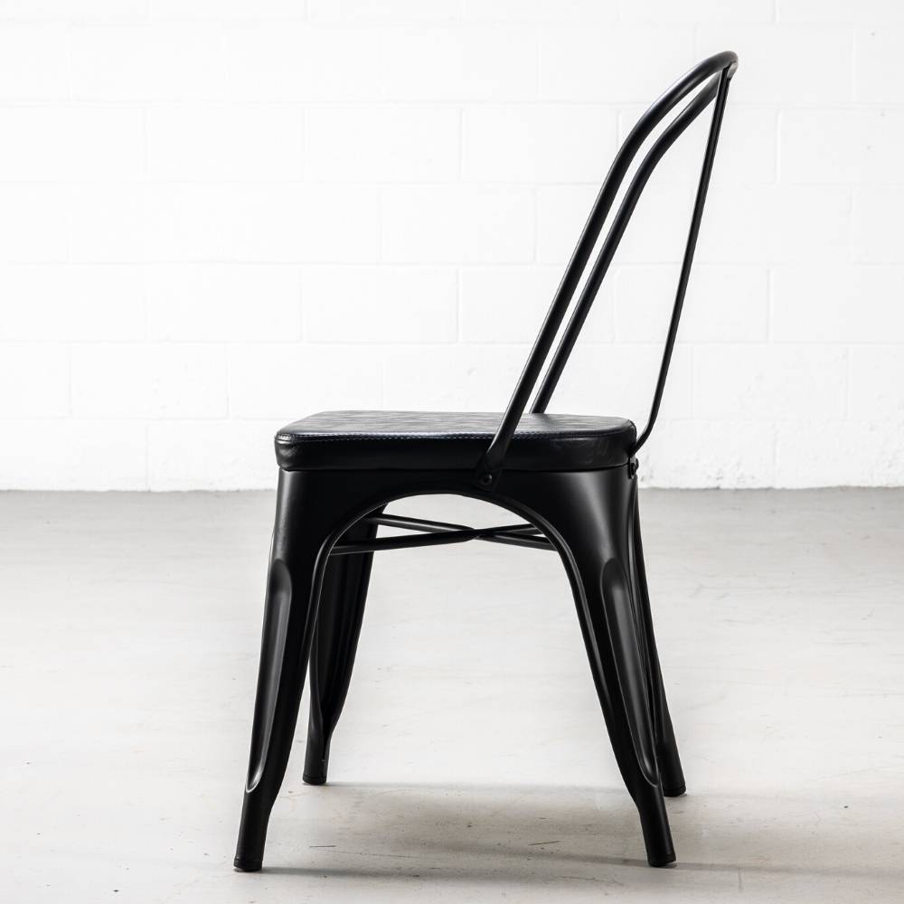 The Ari Dining Chair pairs a modern black metal frame with a comfortable black vegan leather seat. It is our modern twist on the classic Tolix Chair. Perfect for home and business; this chair was designed to last for years and years.