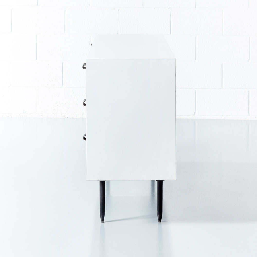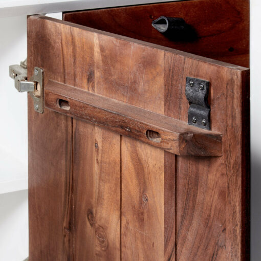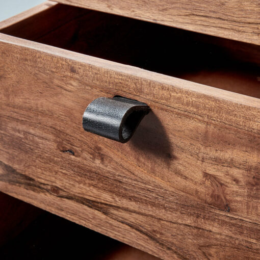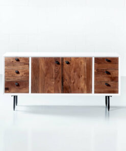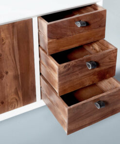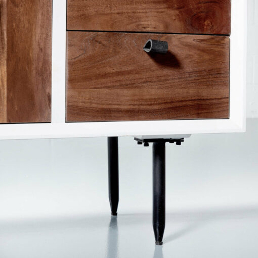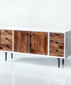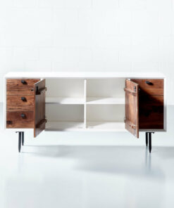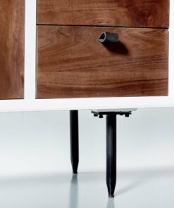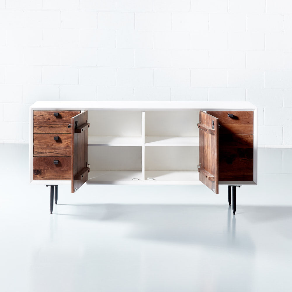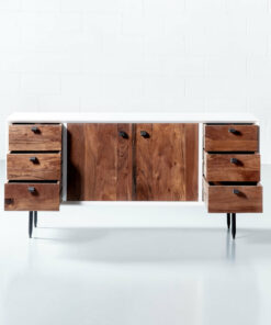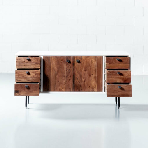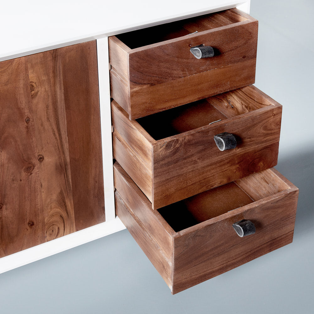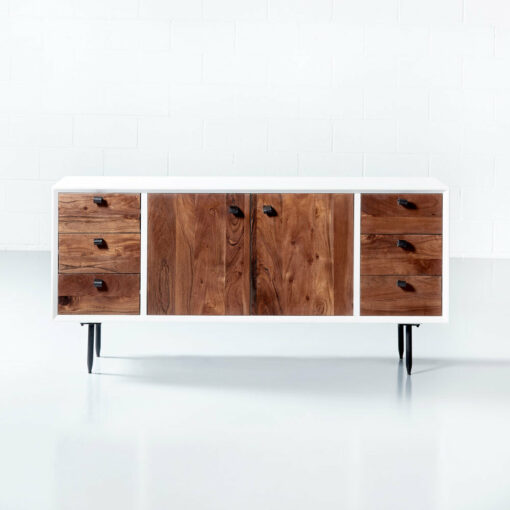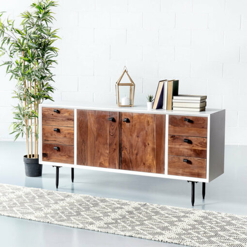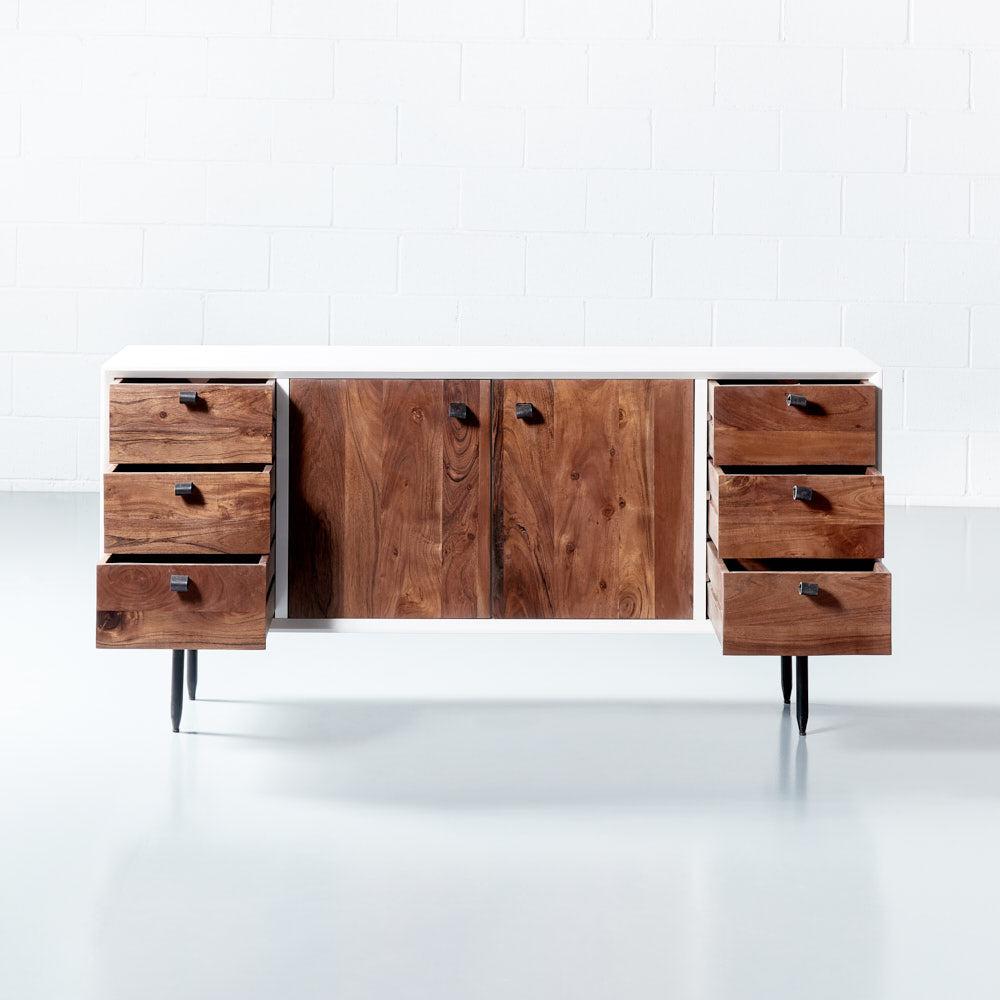 The Chardonnay Sideboard is a Wazo best seller. The perfect combination of light and dark colours. The drawers and cabinets are crafted from solid acacia wood in a walnut finish and the frame is finished in glossy white . The straps are made out of genuine leather and really create a warm elegant look. Showcase the beautiful things in life on the top while hiding treasures in the 6 stylish drawers and 2 cabinets.