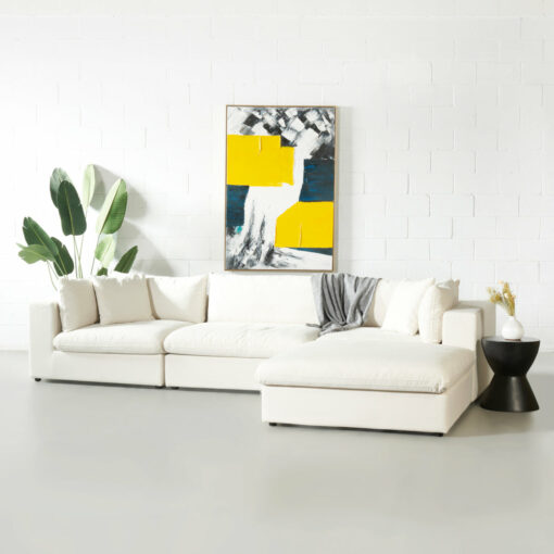 Introducing the COSMIC Modular Sectional, where comfort meets style effortlessly. Sink into superior comfort with its feather mix polyester fiber stuffing and indulge in the soft, cream fabric cover. Rest easy knowing that the removable cover is water-resistant, providing protection against spills and accidents. Experience ultimate comfort and peace of mind with the Cosmic Modular Sectional.