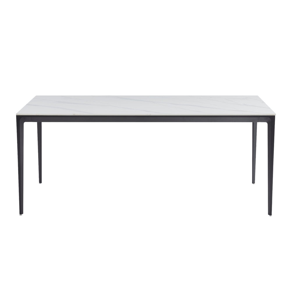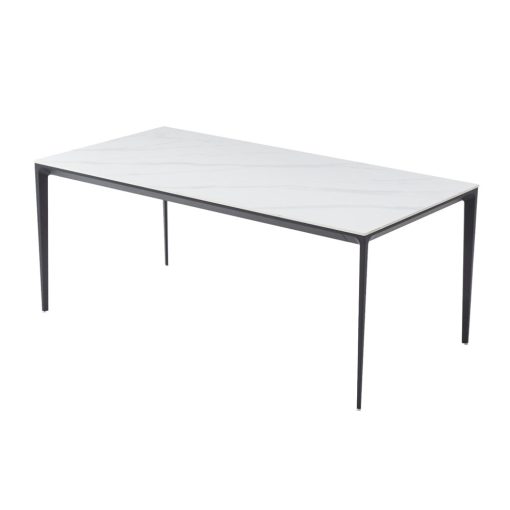Discover the Lisbon Dining Table, featuring a robust sintered stone top with an elegant white pattern, designed for superior resistance to heat, scratches, and stains. Supported by a sturdy iron frame and sleek black legs, this table comfortably seats 6-8 people. Ideal for both family meals and stylish entertaining.