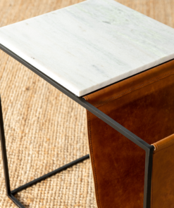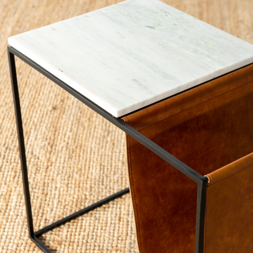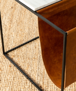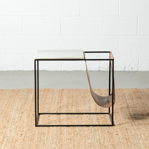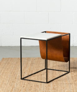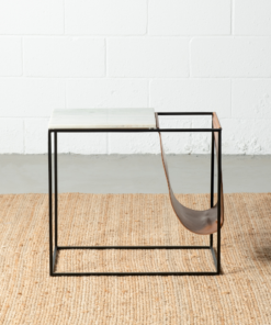 Elegance, modernity and function intertwined perfectly into one side table. Impress your guests with Masika; one of our sleekest side tables, she features a 15 mm thick solid marble top, strong black powder-coated metal frame with a genuine leather magazine sling.