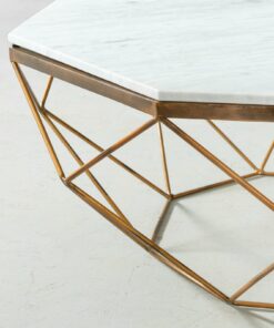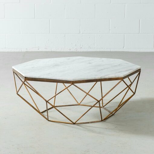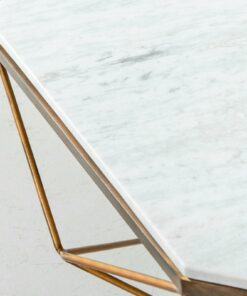 Multifaceted style. A dramatic silhouette with a stunning white marble top and antique brass “legs” to add some excitement to your space. Each piece is uniquely different due to the natural variations in marble.