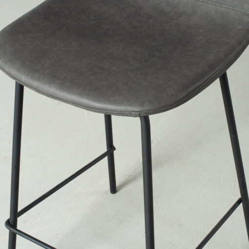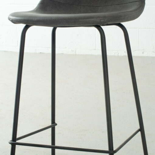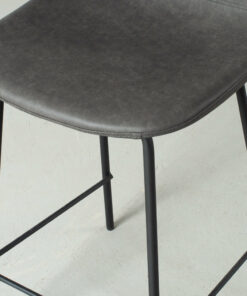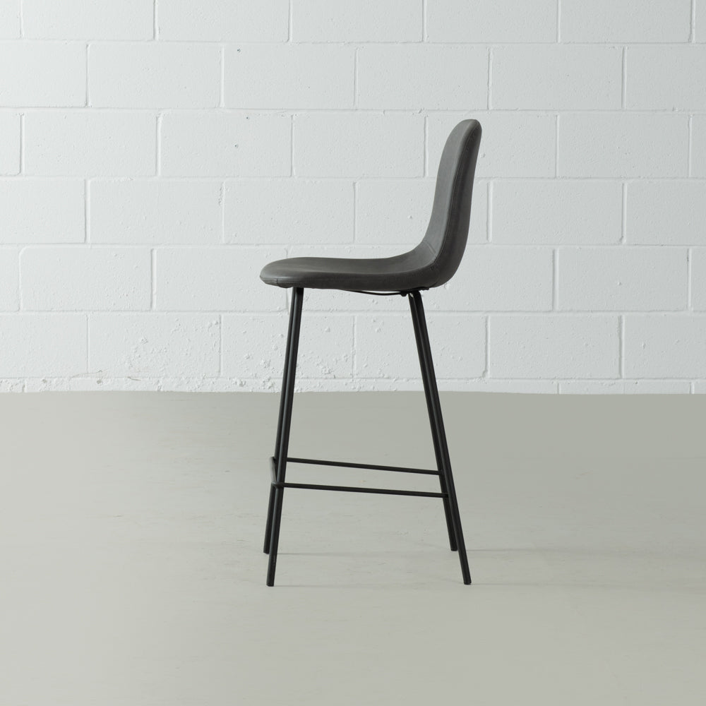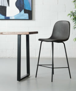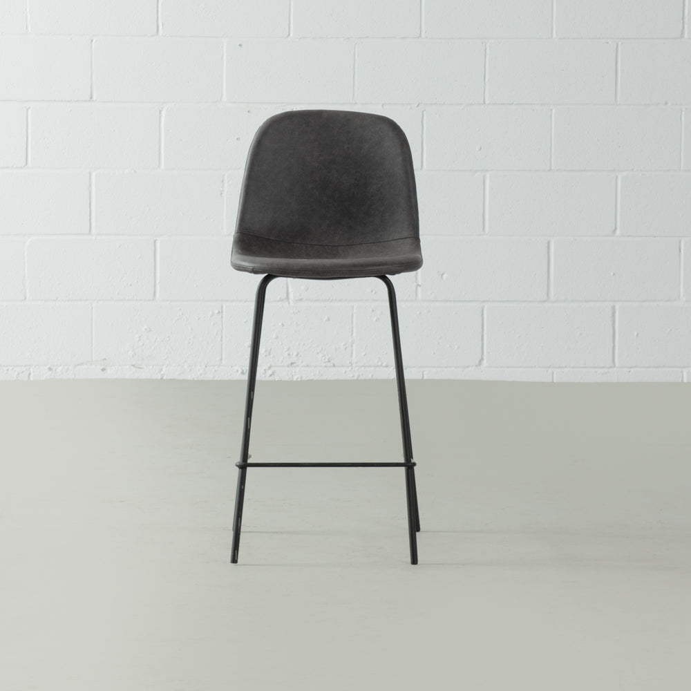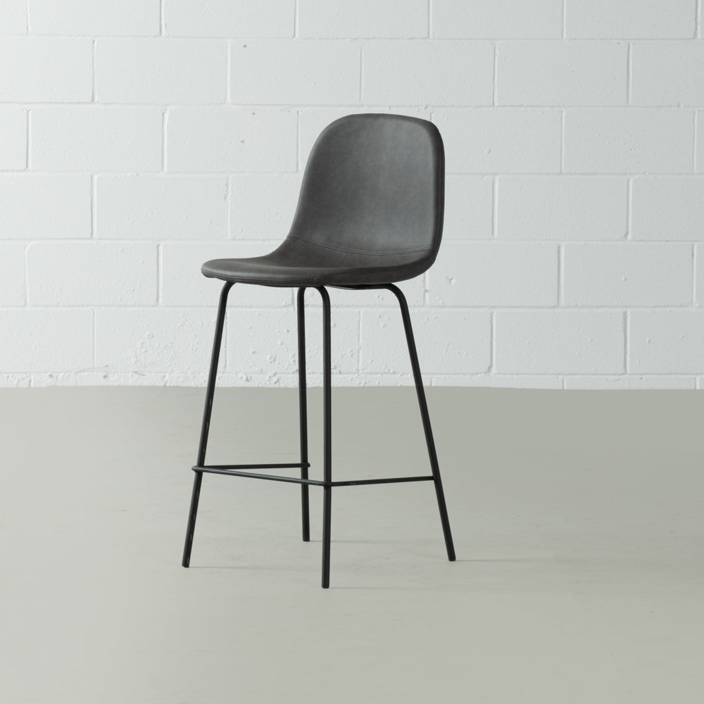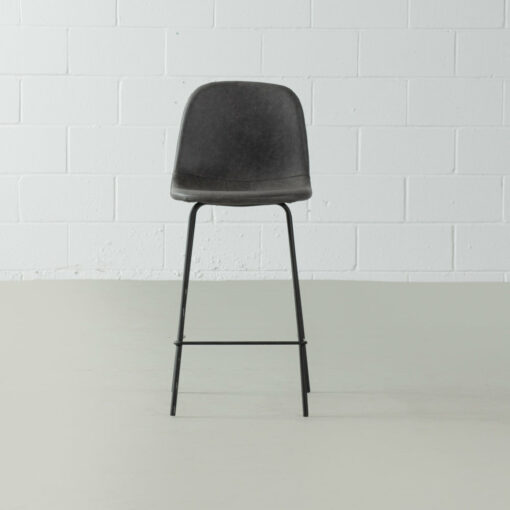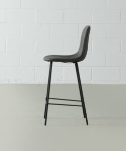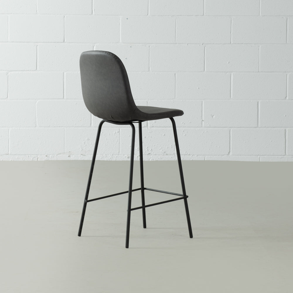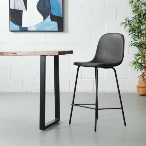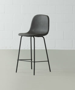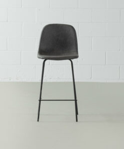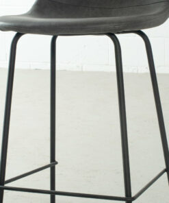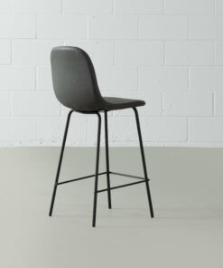 Inspired by the timeless mid-century designs of Charles & Ray Eames. The solid laminated bentwood shell has multiple layers of foam upholstered in dark grey vegan leather. It takes on a new approach to the classic DSW chair, switching out the Eiffel leg design for a solid minimalist metal structure in a matte black finish. Available in black, white, brown, and dark grey. Available in bar height (75 cm) and counter height (65 cm)
