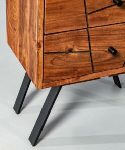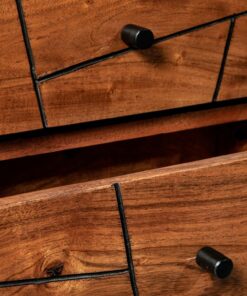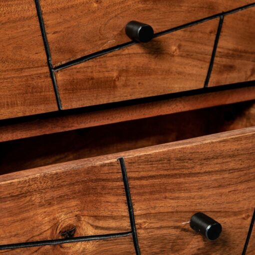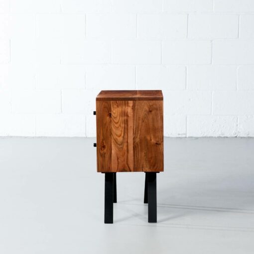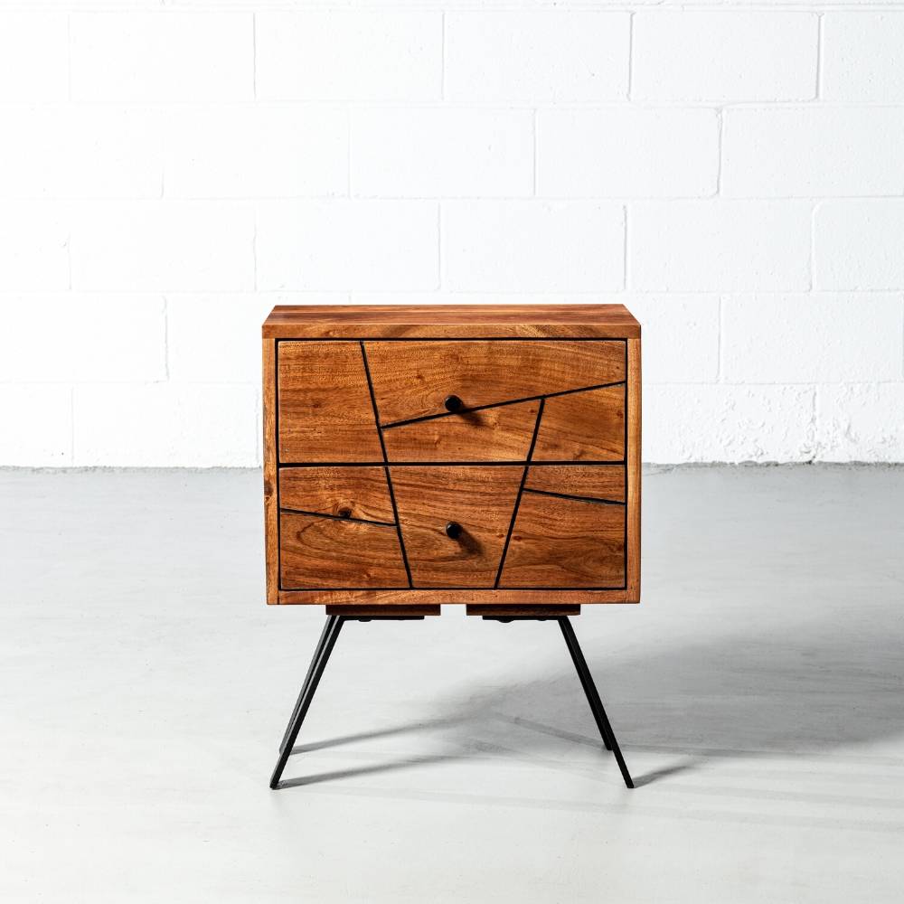 The Palma bedside table has a captivating minimalist design with an elegant geometric twist thanks to its geometric inlays. Handcrafted with solid FSC-certified acacia wood, perfectly polished by skilled artisans, standing on angled black iron legs; this piece was built to last for generations. Make your bedroom a beautiful escape with the Palma Night Table. Get the complete look for your bedroom with the Palma – Mid Century Dresser and the Palma-Mid Century Sideboard.