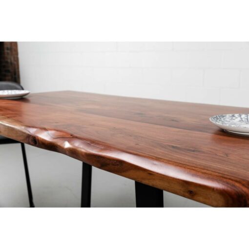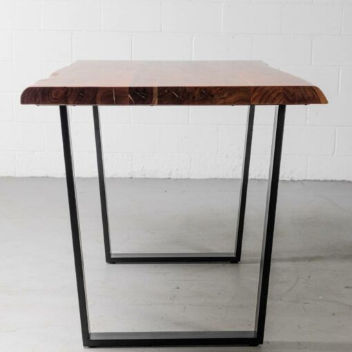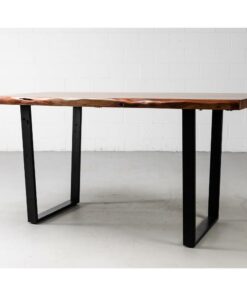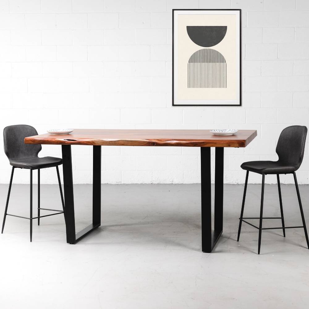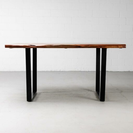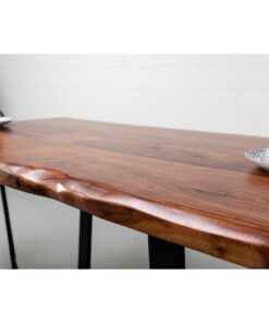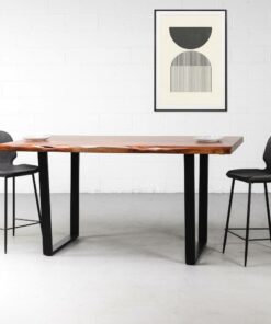 Industrial and rustic, this live-edge bar table is THE table for entertaining. Supported by strong matte black u-shaped metal legs, each Porto live-edge bar table is completely unique; its markings, grooves, crevasses, and knots; its grains, textures, and natural (perfect, in our opinion) imperfections are all its own.